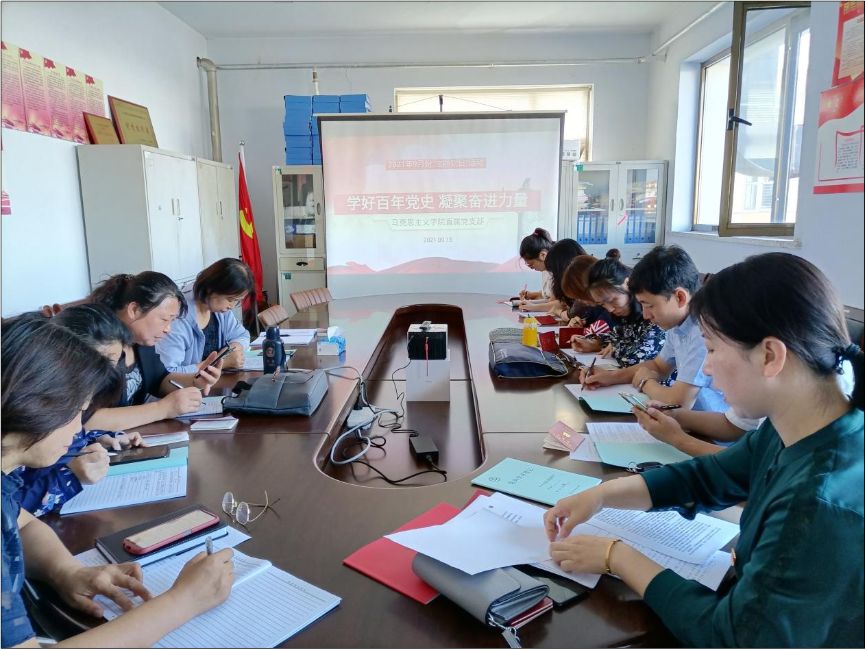 为全面贯彻落实党中央决策部署和省委教育工委有关工作安排,按照《星空·综合(体育中国)官方网站党史学习教育实施方案》等文件要求,马克思主义学院直属党支部于9月15日在行政机关楼509举行“学好百年党史凝聚奋进力量”主题党日活动。会议由马克思主义学院直属党支部书记金鑫主持。