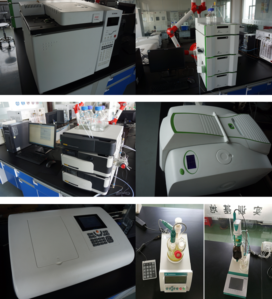 1.分析仪器:气相色谱、液相色谱、傅里叶变换红外光谱 、紫外可见分光光度计、台式PH计、微量水分测定仪、自动电位滴定仪、折光率测定仪、倾点测定仪、色度仪等。