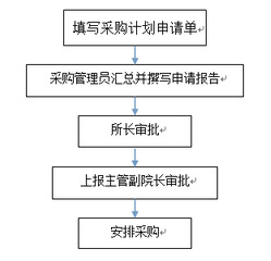 由采购申请人根据需求填写采购计划申请单,由采购管理员汇总并撰写采购申请报告,经所长审批签字,主管副院长审批签字后方可安排采购。一般每月采购1~2次,提出采购申请的时间为每月第一周和第三周周三下午。特别紧急使用的实验用品可单独打报告,随时审批,审批通过后再行采购。采购流程如下: