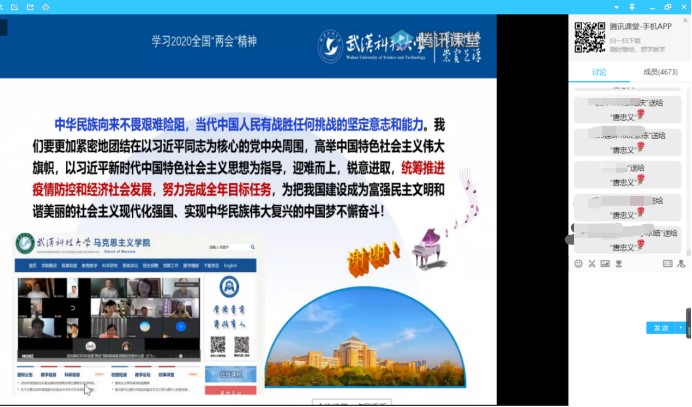 6月18日上午,由武汉科技大学马克思主义学院党委书记马平均主持,中共湖北省委宣讲团成员、湖北意识形态建设研究院院长、武汉科技大学马克思主义学院院长、教授唐忠义主讲的主题为“迎接新挑战,创造新辉煌”的2020全国两会精神辅导报告于腾讯课堂顺利召开。武汉科技大学马克思主义学院全体教师、全校五千余名学生对讲座涉及的内容进行了学习与讨论总结。