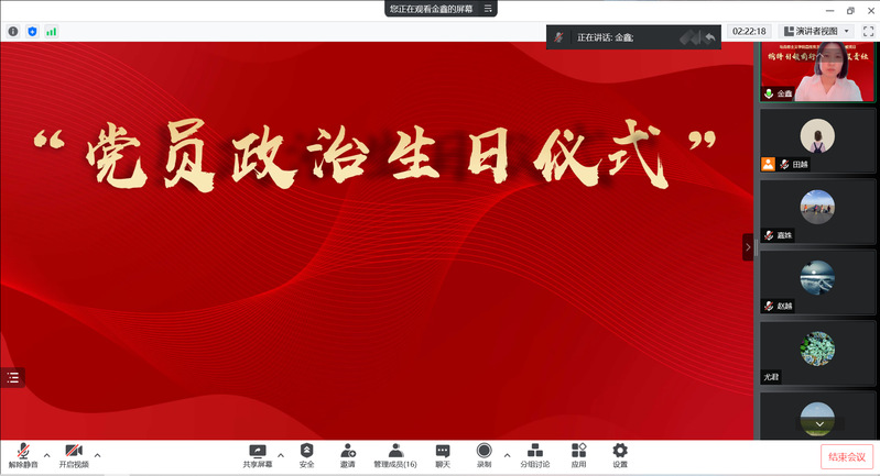 首先,金鑫介绍了此次活动的目的意义,向本月过“政治生日”的四名党员常会斌、肖锦山、赵越、李彩凤表示祝福,通过线上为四名党员赠送“政治生日贺卡”,并宣读了党员政治生日寄语。