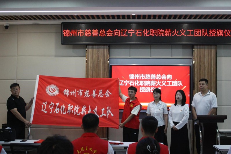 仪式上,王统部长将锦州市慈善总会的旗帜郑重地交给了辽宁石化职院薪火义工团队的代表,象征着双方合作的正式开启。