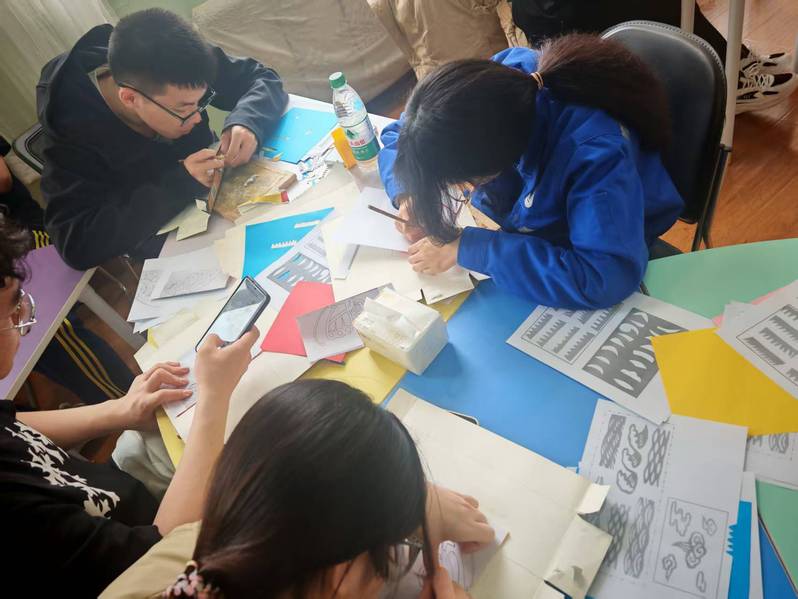 在技艺展示环节,邸老师现场演绎喜鹊登梅剪纸创作。折叠的红纸在银剪流转间渐次成型,引来阵阵惊叹。教学环节中,老师分步演示基础技法,强调心静、手稳、眼准的要诀。实践阶段,参与者使用社团准备的专用工具,在指导下创作简易图样。从最初的纸张破裂到渐入佳境,同学们在反复练习中体悟匠人精神。