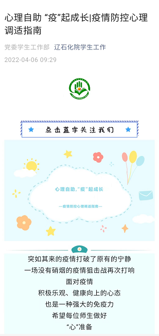 辽宁省心理名师金鑫工作室联合学生处心理咨询中心成立线上心理支持志愿服务队,通过热线电话、微信、QQ等线上平台为学生提供个体心理咨询服务,开通线上心理自测系统,为学生提供免费的心理自测服务。辽石化院学生工作”和“辽石化院心灵驿站”等微信公众号持续推送心理健康专业知识,助力学生客观面对疫情,增强心理抗逆力,适时调适心理,做好自我关照,学会享受“宅式学习”。