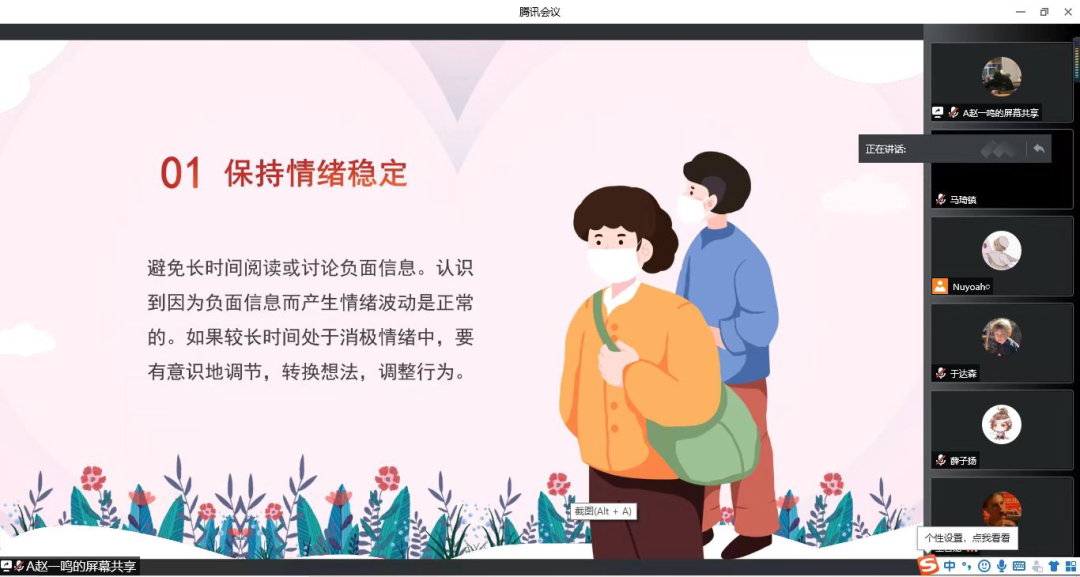 学院学生处心理咨询中心联合马克思主义学院心理健康教研室,邀请大连理工大学胡月教授采用线上讲座的方式,以“学工系统疫情下心理危机问题识别及应对”为主题对学院学工系统相关人员进行培训。胡月教授从疫情应激与心理危机干预、常见心理危机问题的识别以及疫情下心理危机问题应对三个方面进行了讲授。并通过冥想、深呼吸等方法引导参训人员放松身心,加强自我关照。缓解了疫情期间学生管理人员的心理压力,解答了学生管理人员在处理学生心理问题时的困惑,提升了学工队伍的自我心理调适能力和危机干预能力。